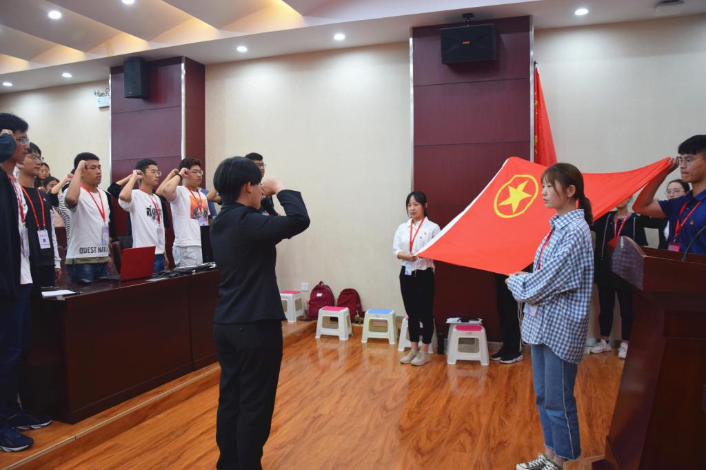 校团委副书记李平向学员代表授旗,随后全体学员重温入团誓词,在团旗前庄严宣誓,仪式在激昂澎湃的团歌歌声中结束。