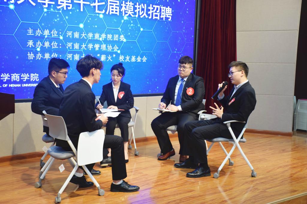 决赛第一环节:直面HR。各位选手在有限的时间内利用PPT、视频等方式向评委展示自己的特长与能力,彰显风采。决赛第二环节:沙场远瞻,10位选手随机分为两组进行无领导小组讨论,思维与思维的相互碰撞,充满思辩和理性的思想一一展现在观众眼前。第三环节:随机应变,在这场较量中,选手面对不同的题目随机应变,深入分析,提出合理解决方案;面对各位老师的提问稳定作答,令人钦佩。